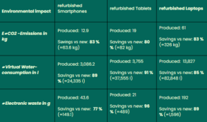 - Buying refurbished smartphones, tablets and laptops instead of new, saves on average: -83% CO2, -80 % e-waste and -89% water.